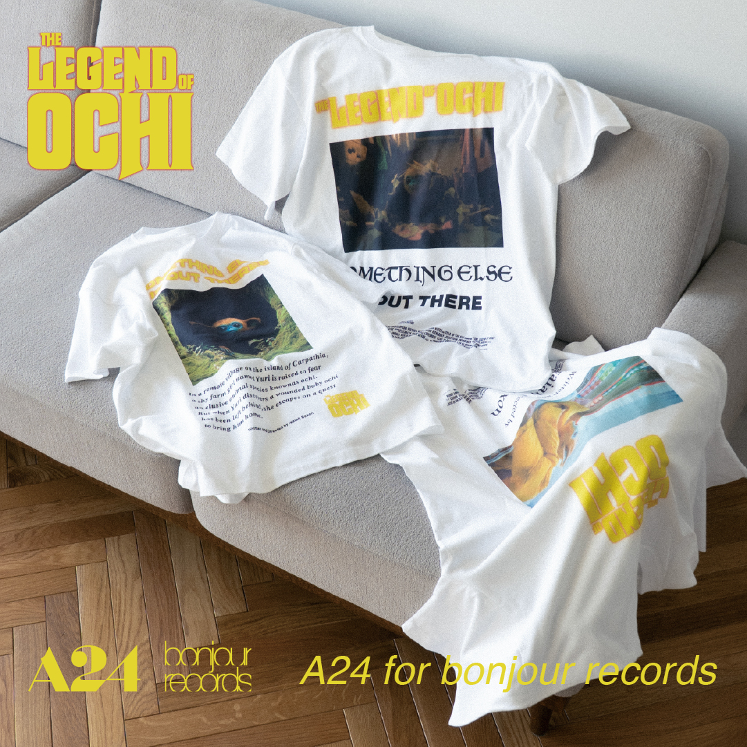 この度 bonjour records では、2012年に設立されたアメリカの映画製作、出資、配給会社であるA24の新作『OCHI!-オチ-(The Legend Of Ochi)』の公開を記念し、bonjour recordsエクスクルーシブ Tシャツを4/3 (金) にbonjour records DAIKANYAMA・Jadore JUN ONLINE にて発売いたします。